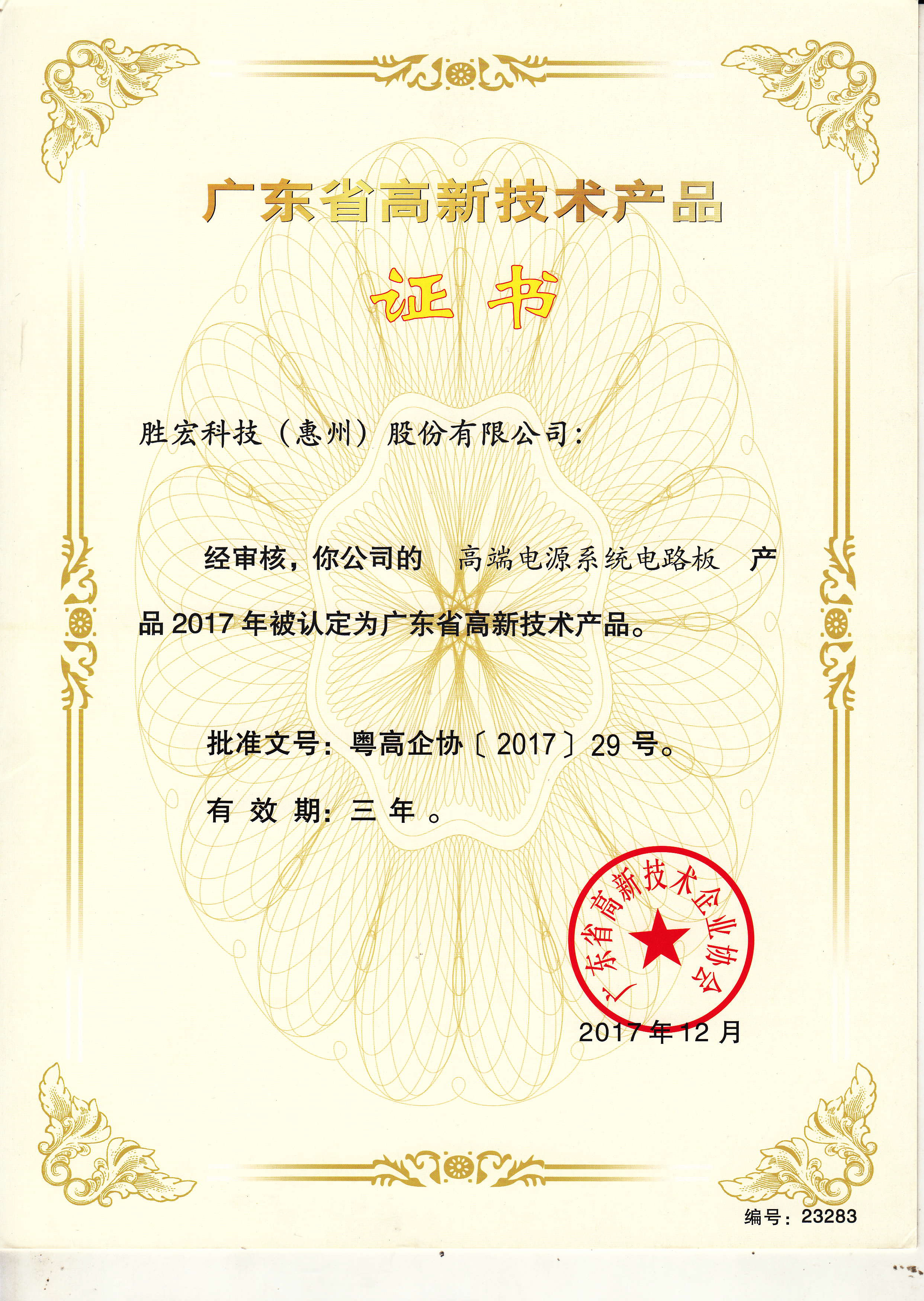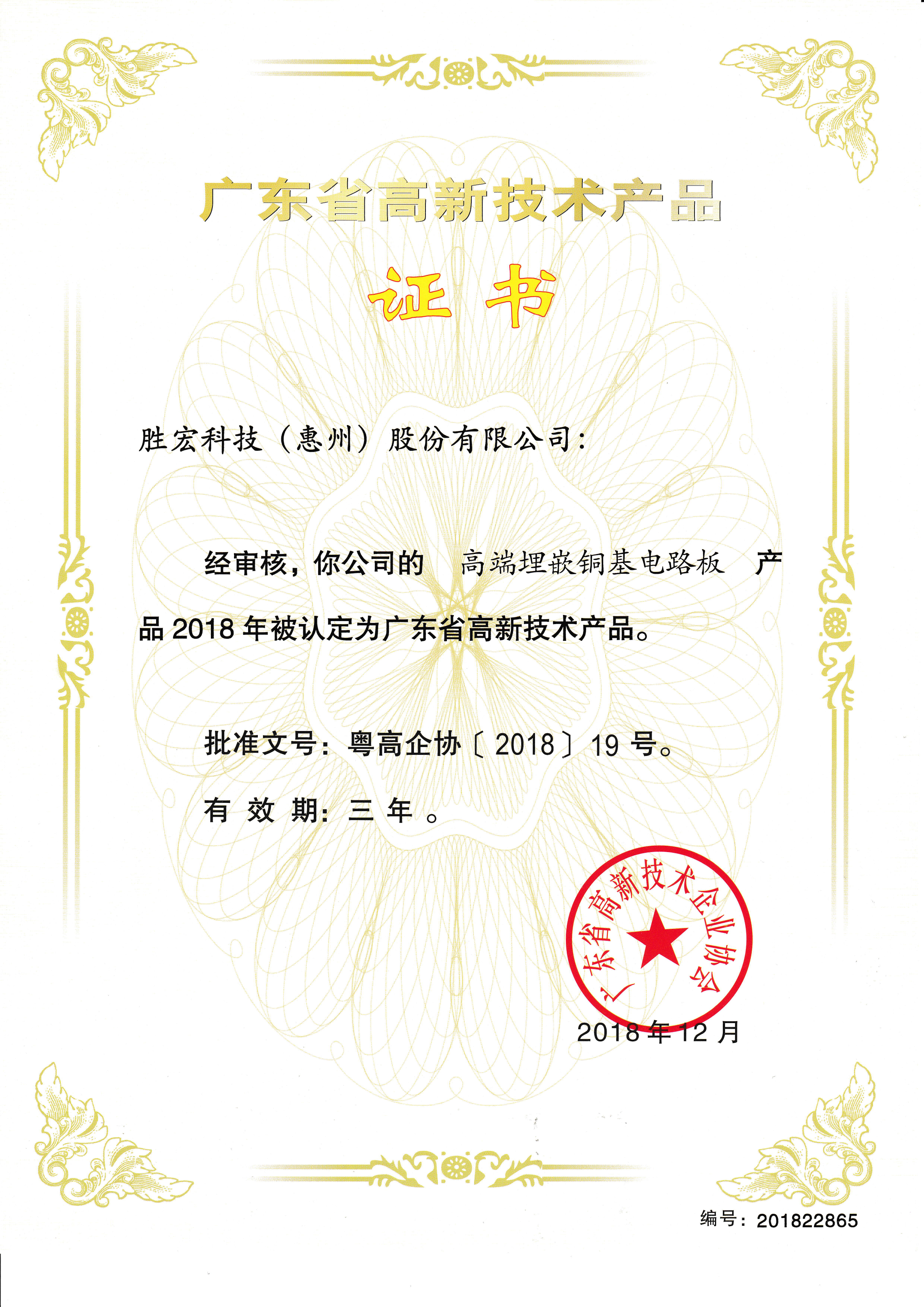 “高端高頻電路板”高新技術產品證書